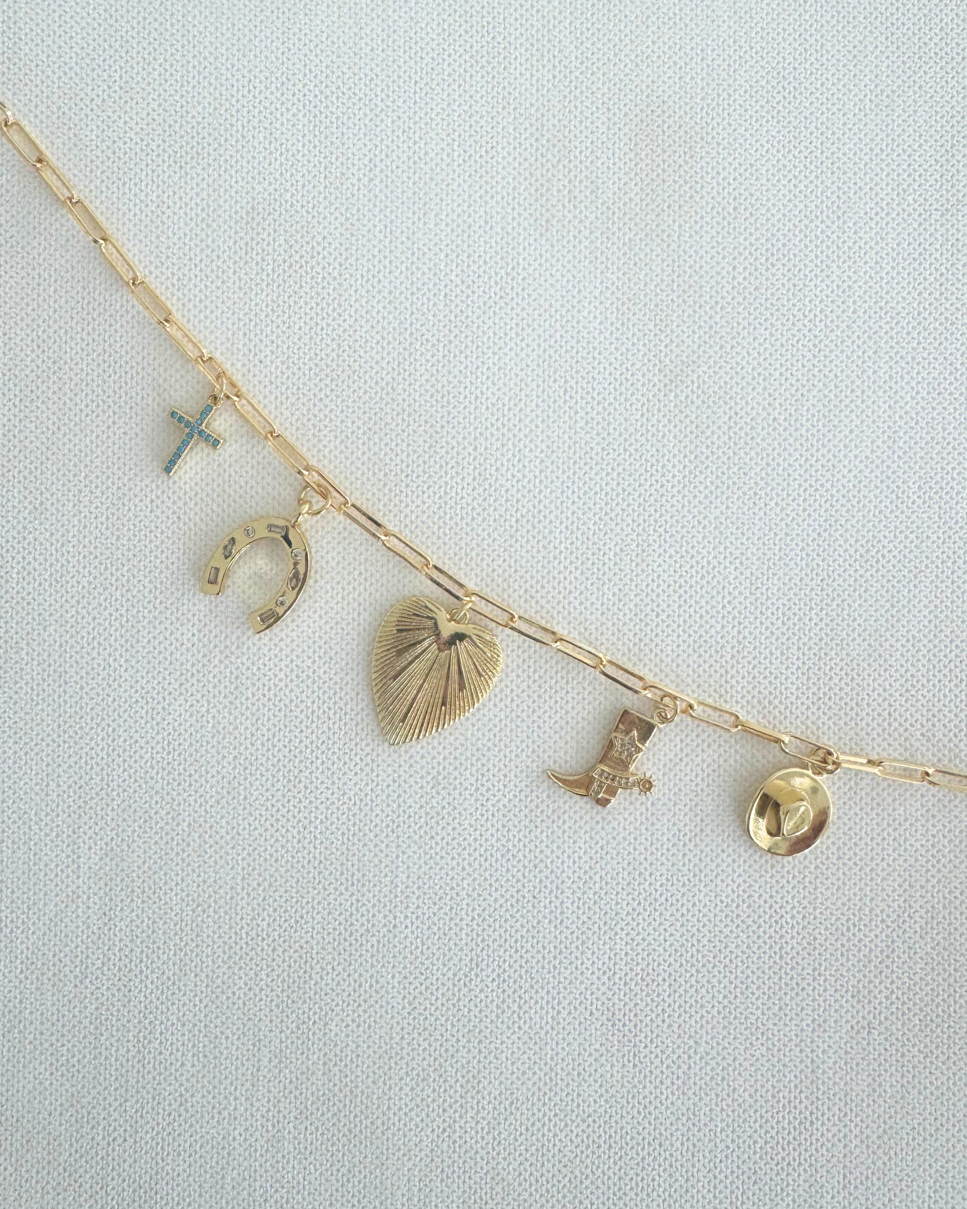 Our Western Charm Chain comes pre-styled with five charms — turquoise cross, horseshoe, heart, boot, and cowboy hat. Strung on a paperclip chain with a double-opening lobster clasp, it adjusts easily to fit your Bible or can be worn as jewelry.